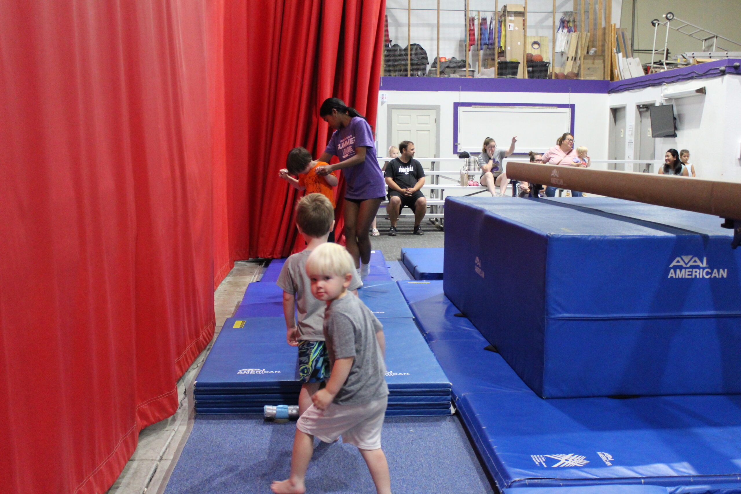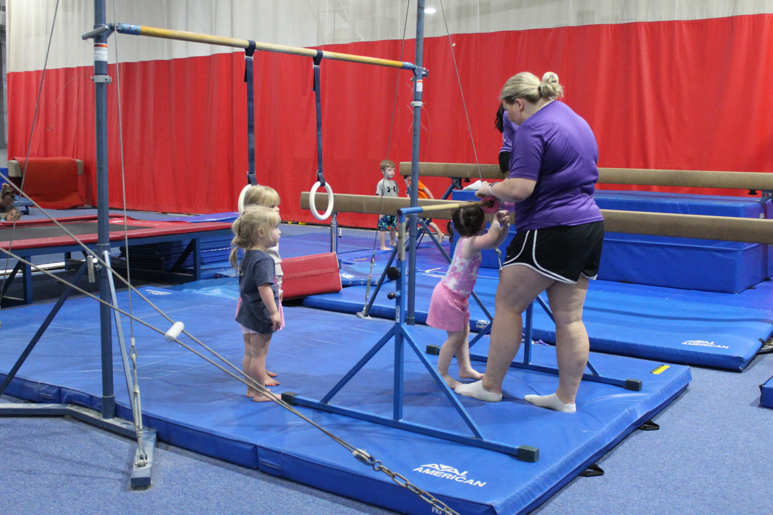 Our gymnastics area offers a springboard tumbling floor, uneven bars, high and low balance beam, a tumble track trampoline and vault.  We offer three levels of gymnastics instruction throughout much of the year. Our instruction is scheduled in 6 class sessions.  We aim to keep student to instructor ratios at 5:1.